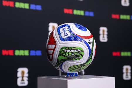 来年6月に開幕するW杯の公式試合球が3日、発表された。名称はスペイン語で「三つの波」を意味する「トリオンダ」。カナダ、メキシコ、米国の3カ国で共催されることに着想を得た。(FIFA提供) 【時事通信社】