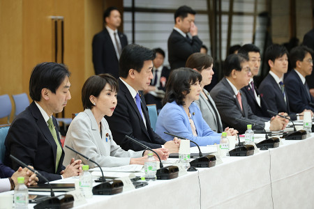 政府は10日、首相官邸で「強い経済」の実現を目指す「日本成長戦略会議」(議長・高市早苗首相)の初会合を開いた。写真は発言する高市首相(左から2人目)。左端は城内実日本成長戦略担当相。 【時事通信社】