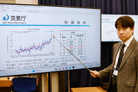 世界中の万博に通い、「万博おばあちゃん」の愛称で知られる山田外美代さん(左)が「万博を訪れた最多日数」のギネス世界記録の認定を受けたことが、大阪観光局の定例記者会見で発表された=23日、大阪市中央区 【時事通信社】