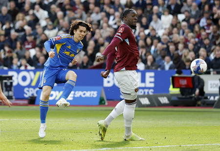 サッカーのイングランド協会杯で5日、リーズの田中碧(左)はウェストハムとの準々決勝で前半に先制ゴールを決め、後半途中までプレーした。チームは延長戦を終えて2―2からのPK戦を4―2で制した=ロンドン 【ロイター時事】