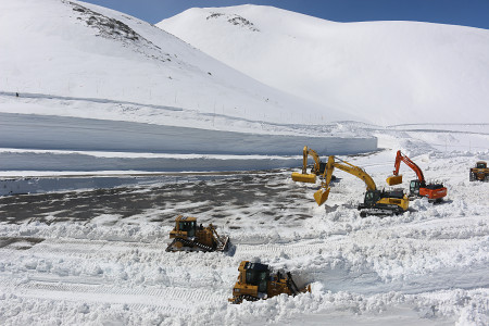 北アルプスを貫いて、富山、長野両県を結ぶ「立山黒部アルペンルート」で除雪が進められている。室堂ターミナルの駐車場(富山県立山町)では8日、ブルドーザーなどの重機が稼働していた。 【時事通信社】