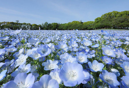 三重県桑名市の観光施設「なばなの里」でネモフィラが見頃を迎え、来園者を楽しませている。「インシグニスブルー」が約100万株植えられており、直径3センチほどの花がじゅうたんのように広がっている=21日 【時事通信社】