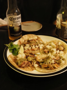 店長の池内翔太さんは「タコスはメキシカンスタイルで、トルティーヤ生地はトウモロコシの粉から作っている」と説明。タコスは6種類で、一番よく出るのは「カルニタス」(550円)という豚肉のトルティーヤという。「カットした豚肉をラードとスパイスで煮込んでのせたメキシコの定番タコス。自家製のタマネギサルサをたっぷりのせていてさっぱりと食べられる」と話す。「ハイビスカスと塩豆腐」(500円)などのオリジナルタコスも用意する。料理は「エビのテキーラ炒め」(750円)などの酒に合うアラカルトメニューもそろえる。