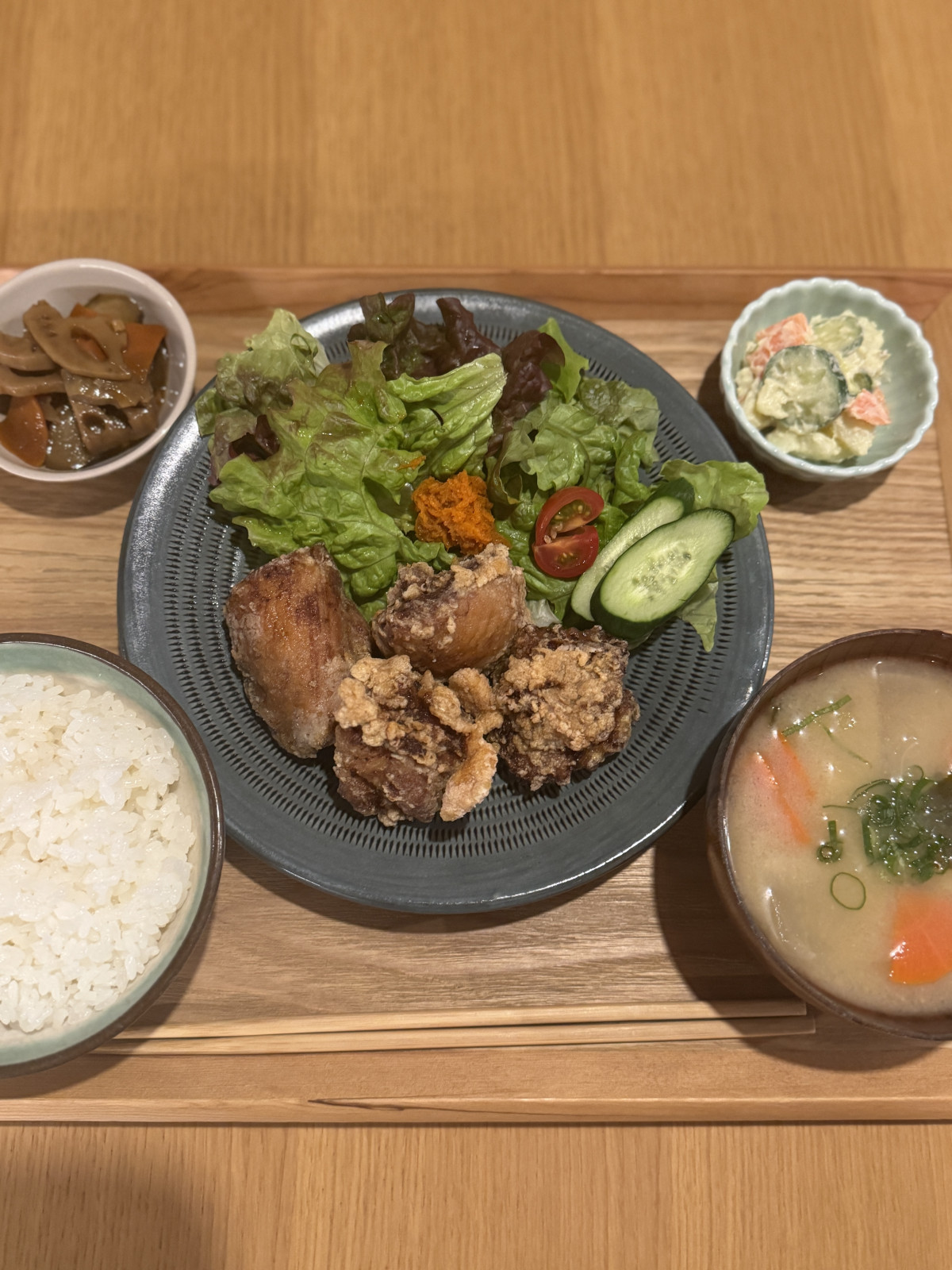 ランチは日替わりの定食、カレー(1,050円)のほか、13時からのメニューとして週替わりの丼(700円)を用意する。写真は日替わりメニューで唐揚げの定食。(写真提供=ヨルの部)