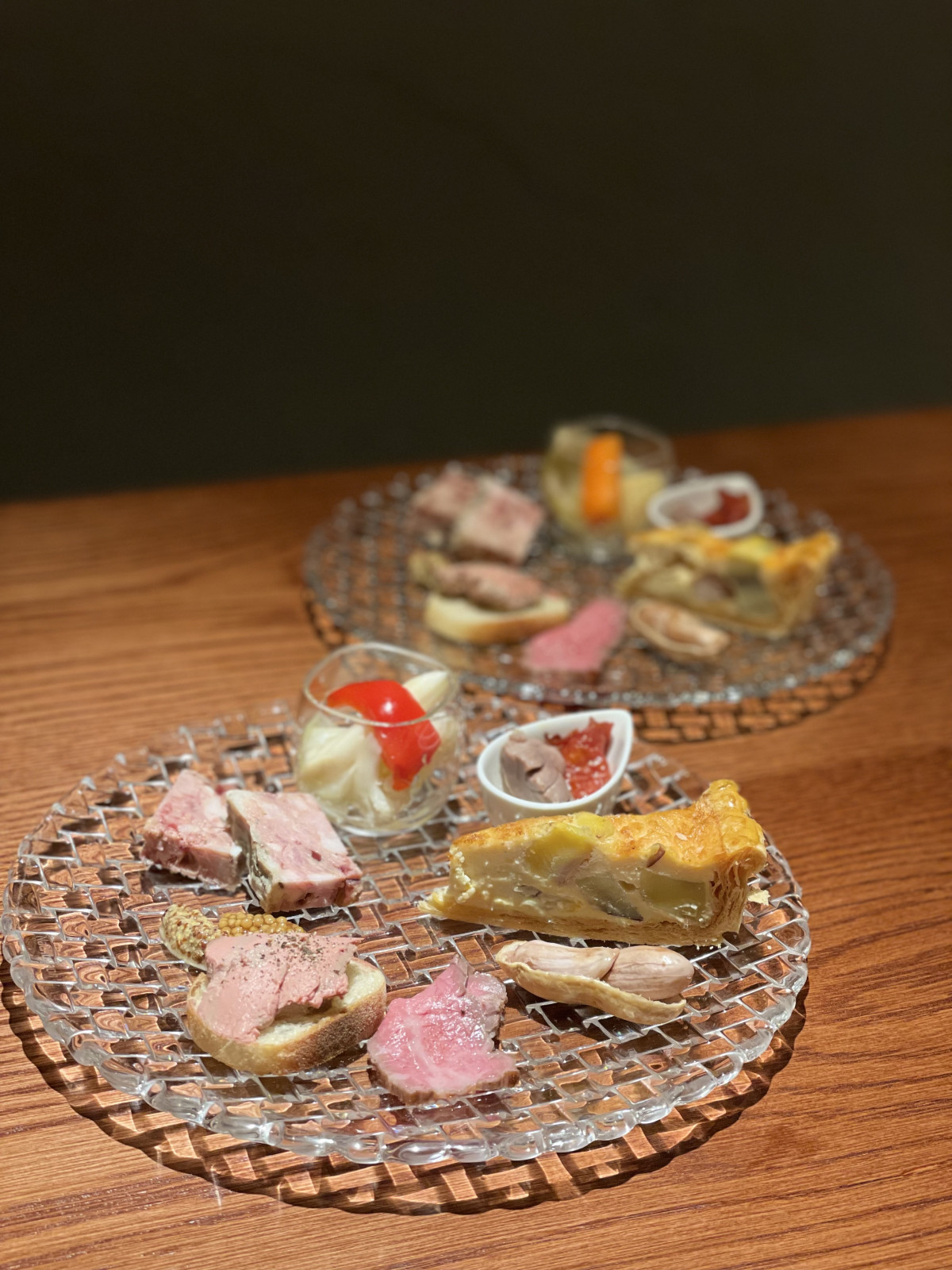 「前菜盛り合わせ」(1,200円)はその日のお薦めを5種類盛り合わせる。写真は一例で、キッシュや自家製ピクルス、レバーパテ、黒毛和牛のローストビーフ、落花生の塩ゆでなど。