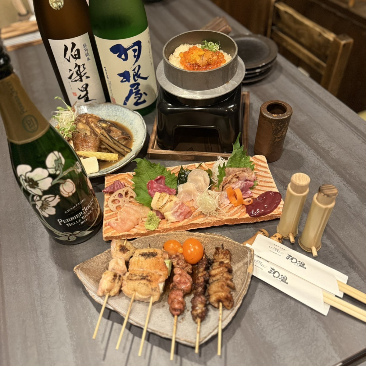炭火は土佐備長炭で、焼き鳥のほか魚介類や野菜の炭火焼きも用意する。酒はビール、焼酎、日本酒などをそろえる。(写真提供=炭焼きと釜飯 和温)