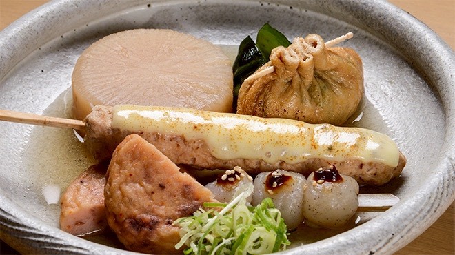 おでん(270円~)の具材は約20種類で、おまかせの5種盛り(990円)も用意する。(写真提供=おでんと、アジフライ。 船場センタービル店)