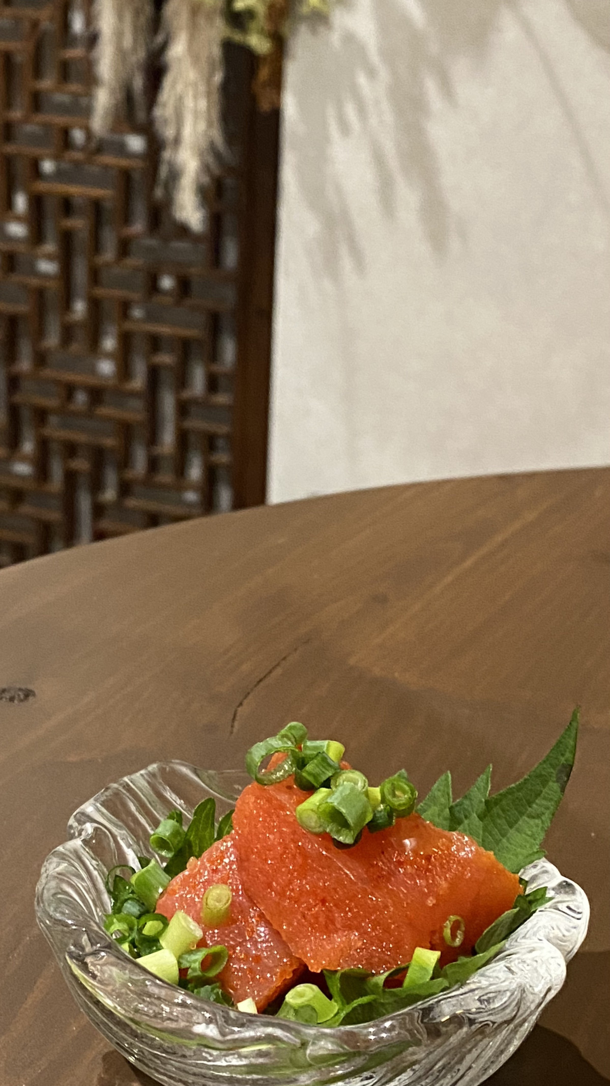 めんたいこはピリ辛味で酒がすすむ=肥後橋「余薫」