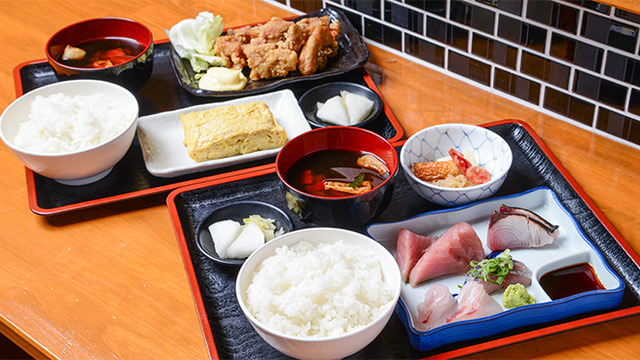 ランチは6、7種類用意する。メニューはおでんとだし巻き定食(800円)やとり唐とだし巻き定食(880円)、お造り定食(900円)など。地域最安値を目指したいという。(写真提供=北浜とく兵衛)