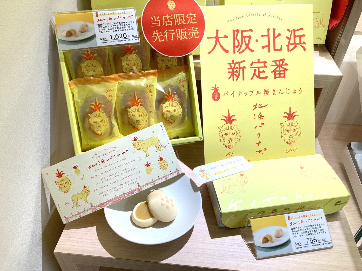 「北浜パイナポー」(3個=756円、6個=1,620円)はパイナップル果汁が入った焼きまんじゅうで、現在は京阪淀屋橋店のみで販売する。商品はライオン橋の愛称がある難波橋がモチーフになったといい、画家の田中健太郎さんのイラストをあしらう。