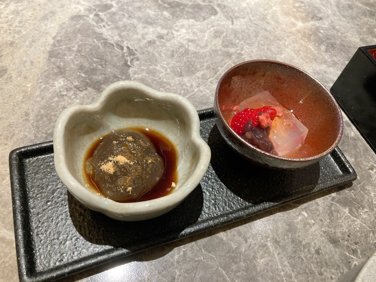 賞味期限30秒というわらび餅(左)は黒蜜をかけて提供する。右はイチゴをあしらったあんみつ。
