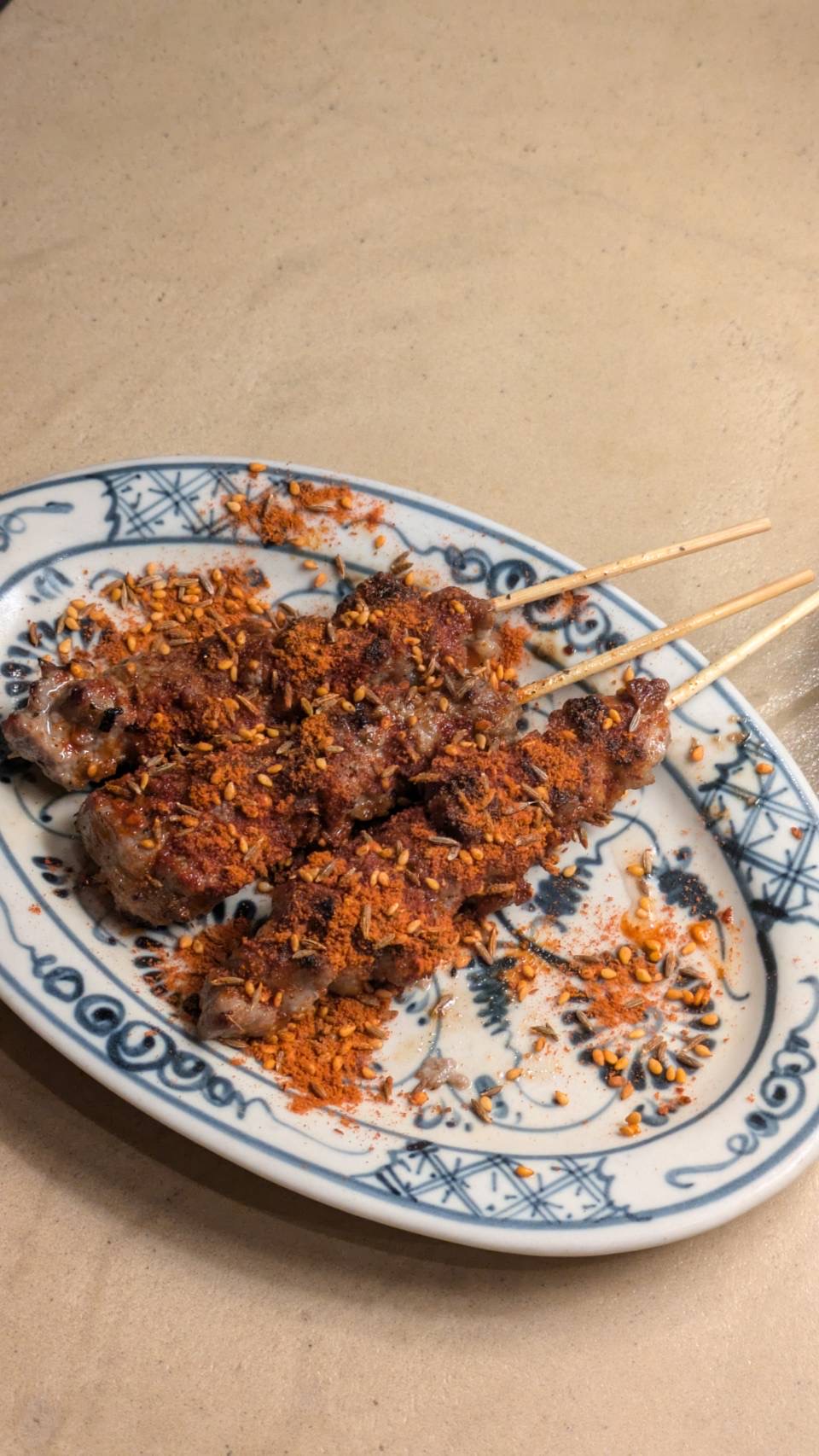スパイスがたっぷりかかった名物のラム串=大阪・本町「ラムのラヴソング2」