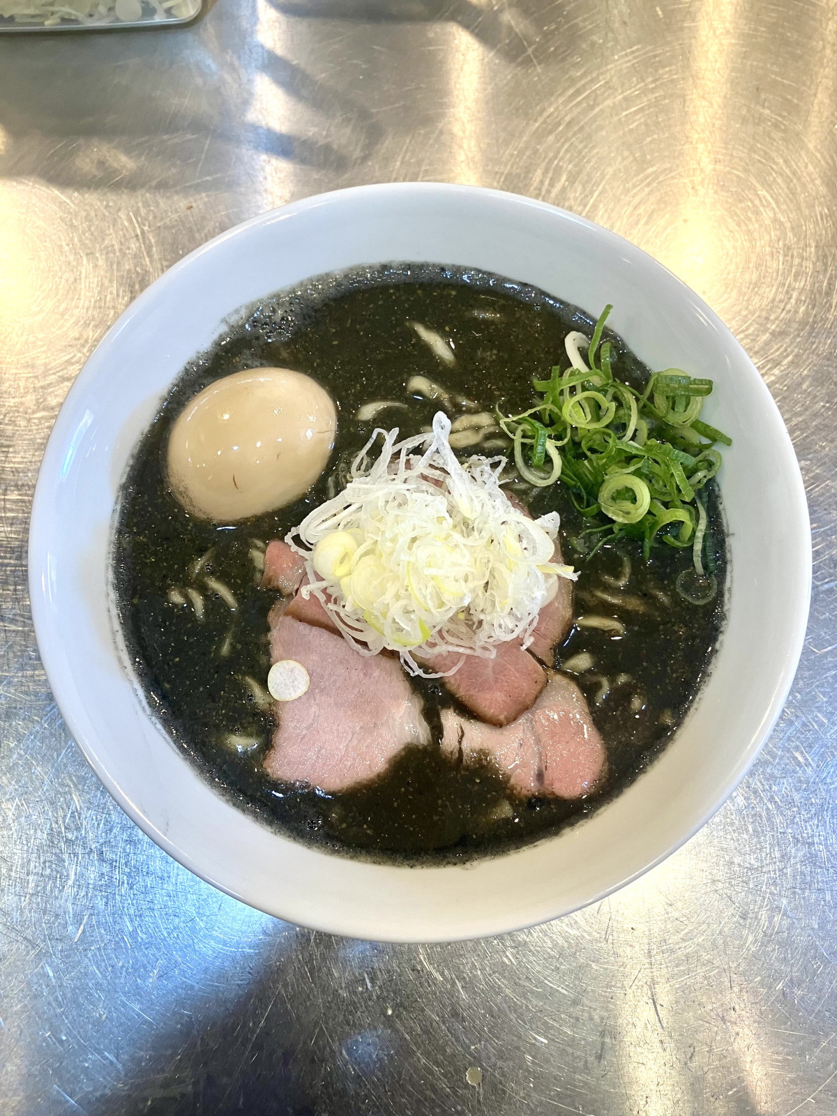 写真は味玉ののった「濃厚黒味噌中華そば」(1,150円)。黒い色は竹炭といい、にんにくがしっかり利いた味という。(写真提供=中華そば 二誠)