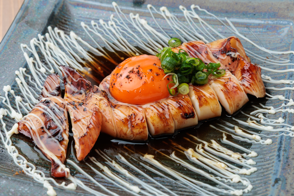 丸ごと一杯を焼き上げた屋台風イカ焼き=肥後橋「炉端ヤ 炭ずみ」
