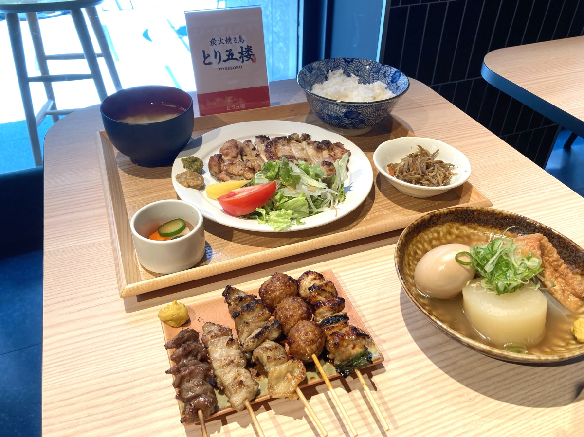 「炭火焼き鳥 とり五楼」の鶏肉は鳥取県のブランド鶏「大山どり」。焼き鳥の盛り合わせ(5本=979円)や「あご出汁(だし)おでん3種盛り合わせ」(550円)のほか、ランチは唐揚げ定食(1,100円)などをそろえる。