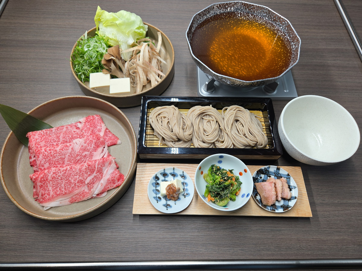 「厳選和牛と職人だしのそばしゃぶ」(5,368円)は和牛のしゃぶしゃぶの後にそばを入れる鍋料理。鍋は一人鍋で、和牛のほか沖縄しまぶたのしゃぶしゃぶ(3,828円)、鴨すき(4,598円)などの鍋メニューも用意する。(写真提供=総本家浪花そば 庵)
