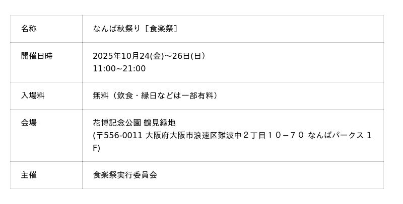 2025年10月24日(金),25日(土),26日(日)の3日間「なんば秋祭り[食楽祭]」をなんばパークス「なんばカーニバルモール」(大阪市浪速区)にて開催いたします。