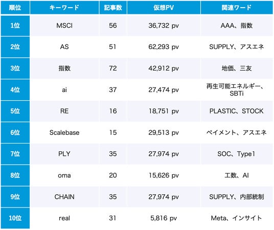 ランキングに反映された情報は、ほとんどが企業の配信したプレスリリースでした。おもなものはアスエネ株式会社のESG評価クラウドサービス「ASUENE ESG」の「ASUENE SUPPLY CHAIN」への名称変更、株式会社estomaのESG情報統合管理クラウド「estoma」の「AI自動転記機能」リリース、株式会社ロゼッタのESG活動動向分析AIエージェント「Metareal ESGインサイト」プレミアムプラン提供開始などです。
