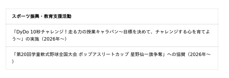 2026年度は、授業を通じて子どもたちの体力・走力向上を図るとともに、明確な目標を設定してチャレンジする楽しさや自己肯定感を育むことを目的とした「DyDo 10秒チャレンジ!走る力の授業キャラバン~目標を決めて、チャレンジする心を育てよう~」、子どもたちの健全な成長および地域スポーツ文化の発展への寄与を目的とした「第20回学童軟式野球全国大会 ポップアスリートカップ 星野仙一旗争奪」への協賛、ならびに資源の有効活用や環境意識の醸成につながるアップサイクル活動などを、新たな活動として実施いたします。