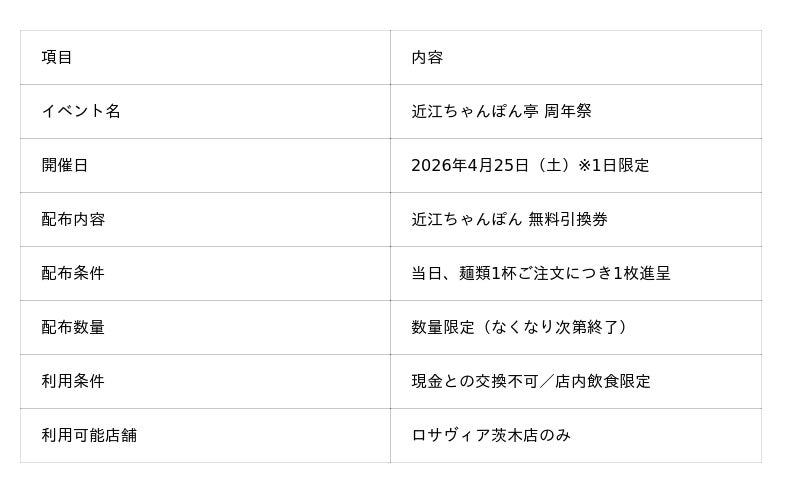 「近江のちゃんぽんをニッポンのちゃんぽんに!」をスローガンに掲げるドリームフーズ株式会社(本社:滋賀県彦根市/代表取締役社長:山本英柱)は、近江ちゃんぽん亭 ロサヴィア茨木店(大阪府茨木市)が1周年を迎えたことを記念し、2026年4月25日(土)に「周年祭」を開催いたします。