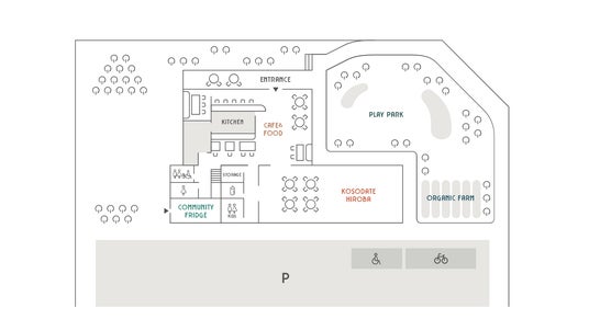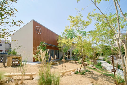 FLATは「食事・子ども・遊び・家族・コミュニティ」の5つを“枝”とし、そロゴに込めた“枝”のコンセプトを空間構成や内装サインに展開し、視覚的・構造的に理念を共有できるデザインを実現しています。また、プレーパークを囲う建築配置により、親子の安心感と見守りやすさを両立。他の子育て支援施設と異なり、カフェ機能を日常の導入点とすることで、気軽に立ち寄れる共育空間を構築しています。加えて120種以上の植栽やベビーフレンドリーな設備を備え、子育て世帯が日常的に交流できる複合施設として、地域の共育環境を形にしました。