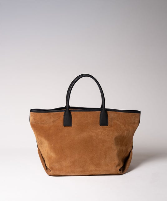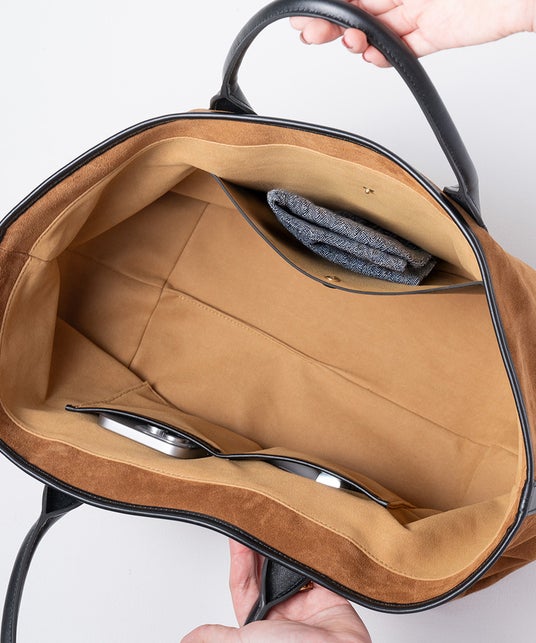 静かに存在感を放つ本革スエードをベースにした大きめのトートバッグ。ハンドルやパイピングにまで本革をあしらい、統一感のある美しい仕立てに。