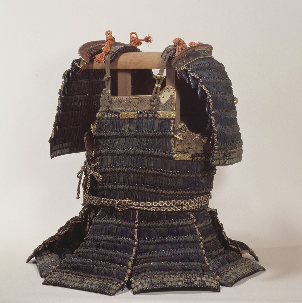 本作は壺井八幡宮に伝来したもので、黒韋(くろかわ)(濃い藍色に染めた鹿のなめし革)で小札(こざね)を綴り合せて(威(おど)して)います。全体的な様式から、南北朝時代ごろの作品と考えられます。