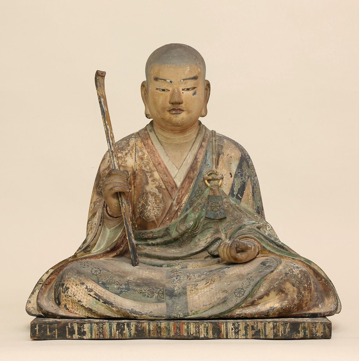 1.木造僧形八幡神像(もくぞうそうぎょうはちまんしんぞう)(重要文化財) 正平(しょうへい)8年~9年(1353~1354) 壺井八幡宮蔵 八幡神は様々な性質を持つ神ですが、河内源氏などの武家からは武神として信仰されました。また神仏(しんぶつ)習合(しゅうごう)のもと、剃髪(ていはつ)し袈裟(けさ)を着た僧の姿(僧形八幡神)で表現することが行われました。本作もその一例で、現在は女神(伝神功皇后(でんじんぐうこうごう))像1躯、男神(伝仲哀(でんちゅうあい)天皇)像1躯、脇侍の童子像2躯(すべて重要文化財)とともに、壺井八幡宮の本殿に納められています。