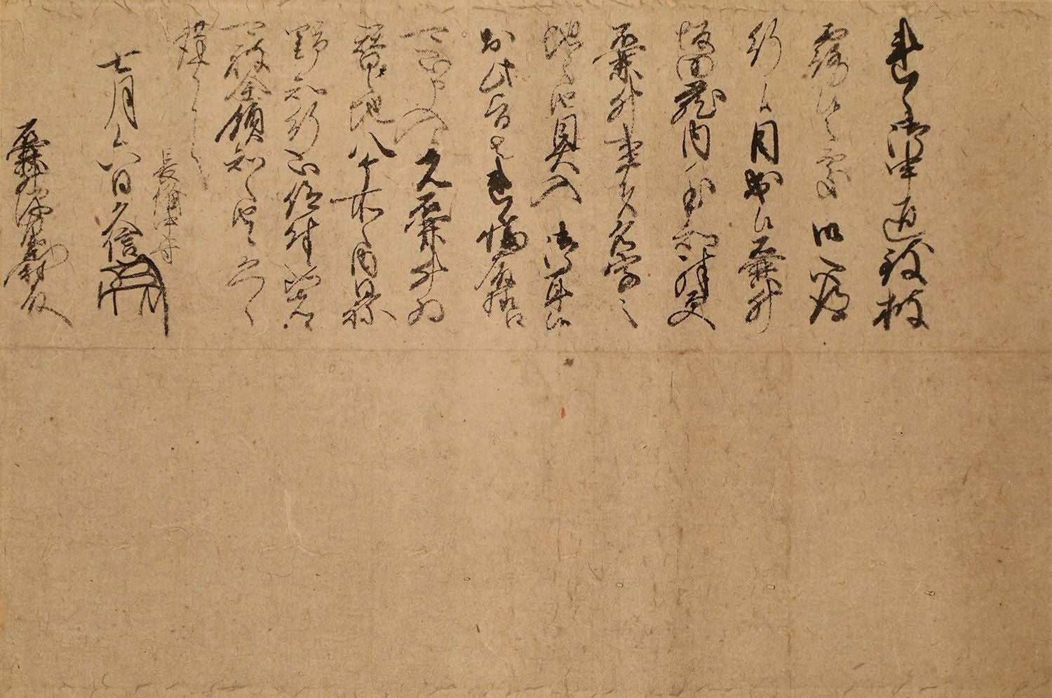 4.長久信(ちょうひさのぶ)折紙 (年未詳)7月6日付 壺井八幡宮蔵 畠山尚順(はたけやまひさのぶ)(1475~1522)の家臣である長久信が壺井源左衛門尉(げんざえもんのじょう)に対し、源左衛門尉の領地に関する尚順の指示を伝えるものです。源左衛門尉は畠山氏に対し、特に壺井は「名字の地」であると訴えていますが、畠山氏は壺井に代わる別の地を与えようとしています。戦国時代の混乱のなか、在地の武士が領地を維持することが困難であった様子がうかがえます。