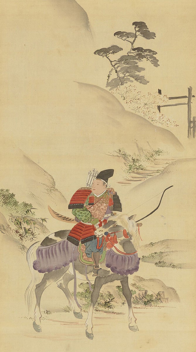 本作は明治期の大阪で活躍した四条派(しじょうは)系の画家・久保田桃水(くぼたとうすい)の弟子である翠松の作と伝わっており、四条派の特徴である柔らかな色彩と筆運びで、馬上の義家を描きます。奥に木戸と桜を配しており、『千載和歌集』に取材したものといえます。