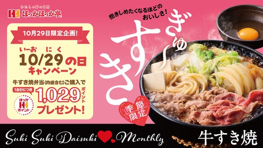 持ち帰り弁当事業のパイオニアである「株式会社ほっかほっか亭総本部」(本社:大阪府大阪市、代表取締役会長兼社長:青木達也)は、2025年10月29日(水)に 「いーおにくの日」限定企画として、ほっかほっか亭冬の人気No.1メニュー「牛すき焼弁当(肉盛含む)」のご購入で、ほっかほっか亭公式アプリ「ほっかアプリ」の「ほっかポイント」を、1,029ポイント分プレゼントするキャンペーンを実施します。
