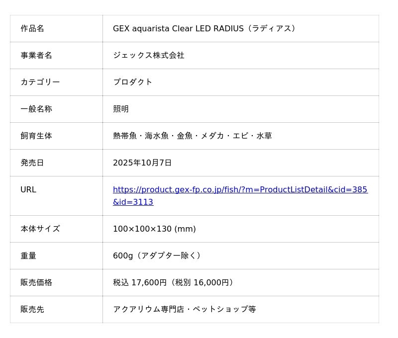 アクアリウム用品シェアNo.1*のジェックス株式会社(大阪府東大阪市、代表取締役社長:五味 宏樹)が発売した「クリアLED RADIUS(ラディアス)」が、グッドアクアリウムデザイン賞2025にてGOLD Prizeを受賞した。GEXがグッドアクアリウムデザイン賞にてGOLD Prizeを受賞するのは8年連続となる。