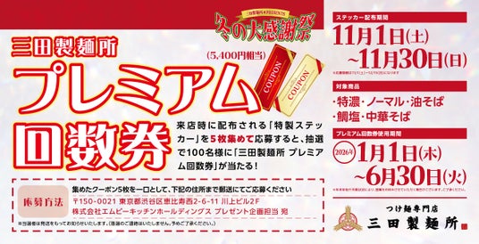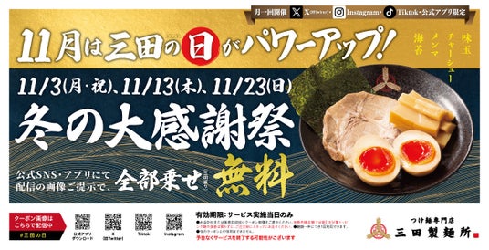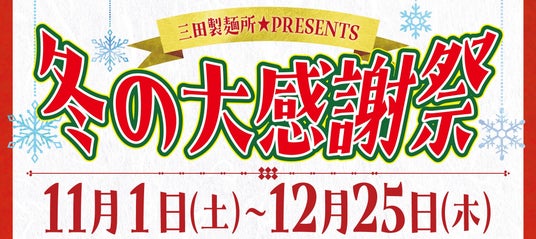 株式会社エムピーキッチンホールディングス(本社:東京都渋谷区、代表取締役:村上竹彦)が運営する「つけ麺専門店 三田製麺所」は、2025年11月1日(土)~12月25日(木)の期間、日頃のご愛顧への感謝を込めて「冬の大感謝祭」を開催いたします。