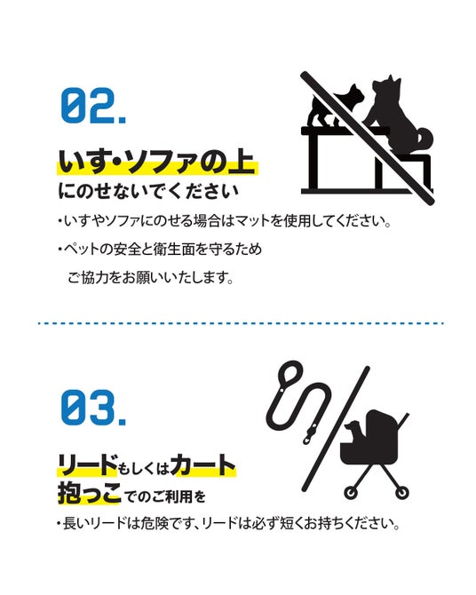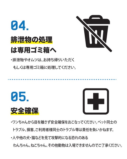 ペット連れの方も、そうでない方も、みんなが気持ちよく過ごせるよう、施設全体でルール啓発を行い、思いやりのあるルールを大切にした空間づくりを進めていきます。