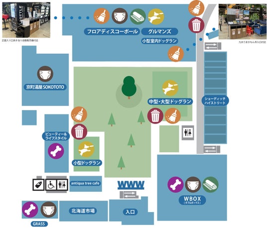 ドッグラン・お掃除ステーション・リードフックなどの設備を館内各所に設置しています。