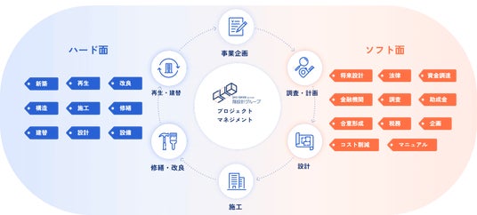 一般的な設計事務所の領域であるハード面だけでなく、ソフト面まで幅広い領域をカバーする建築総合コンサルタント企業