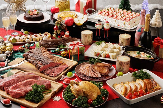 キラキラ輝く聖夜にふさわしい、とびきり贅沢なディナーブッフェ。鉄板の上でジュワッと焼き上げる「はりま牛ステーキ」をはじめ、香ばしい「ローストチキン」やジューシーな「ローストビーフ」など、シェフ自慢のメニューがずらりと並びます。さらに、クリスマスツリーに見立てたロールケーキなどクリスマススイーツもたっぷりご用意!ご家族やご友人と一緒に、笑顔あふれる”とっておきの夜”をお過ごしください。