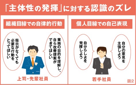 この背景には、図2のように、企業が求める「主体性」と、若手社員が考える「主体性」に認識のズレがある可能性があります。こうした認識のズレは「どのように成長してほしいか」という期待の伝達を阻害することにつながり、若手社員が成長する機会の損失、ひいては、企業全体の停滞を生み出す要因ともなり得ます。