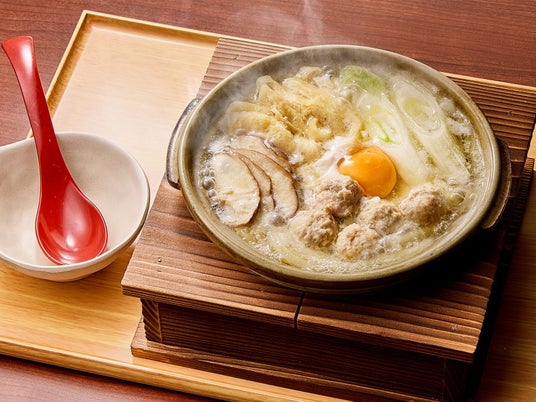 吹田店限定!◆鶏だし 鍋焼うどん 単品 790円 / たまご落とし 890円 / 小ごはん付+100円毎日お店で丁寧に炊き上げる鶏清湯(トリチンタン)だしを使用した、熱々の鍋焼うどんです。鶏の旨みとコクがしっかり感じられながらも、すっきりとした後味が特長。自家製の鶏つくねもたっぷり入っており、つくねからあふれる旨みと麺とからめてお召し上がりください。