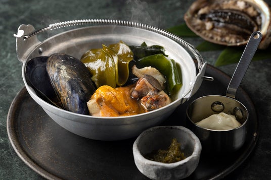 コースのはじまりは、煮しめ入りいなり餅や盛岡駄菓子など、岩手県の郷土料理や味覚を詰め込んだ6種の前菜。温前菜には、希少な赤身が味わえる「いわて短角牛」と芳醇な甘みの脂が魅力の「プラチナポーク」にもち粉をまとわせて焼き、岩塩プレートの上で仕上げてご提供いたします。魚料理では、貝の旨みを感じるだしに餅、雲丹、鮑、つぶ貝、サーモン、わかめなどを入れて魚介鍋仕立てでお楽しみいただきます。メインには、とろける舌触りときめ細かな霜降りが特長の「前沢牛」を、岩手県産の塩や味噌とともにお楽しみください。また、お料理に合わせて岩手県の日本酒やワインも揃えております。
