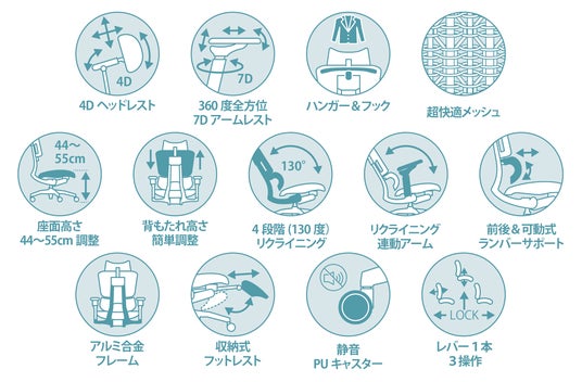 リクライニング時もフレームと一体化しているのでアームレストがついてくるのはもちろん、角度をつければ、さらにスマホ操作や作業時の腕もラクに。後方でも跳ね上げ出来るので前傾姿勢も可能になり、細かな姿勢調整により、あなた史上最高の快適さを生み出します。