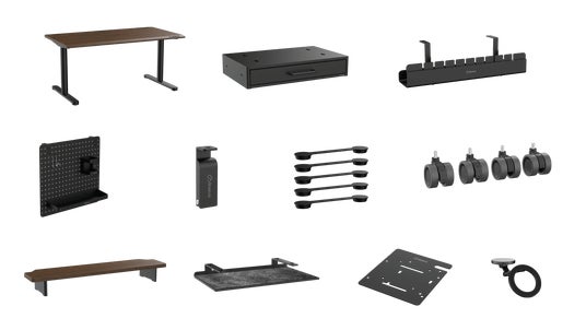 たとえば棚板モジュールを追加して手元に収納スペースを作ったり、モニターアームを取り付けて最大27kgの大型ディスプレイを設置するといった拡張が思いのままです。そのほかPC本体を収容するトレイや折りたたみ式カップホルダー、ケーブルオーガナイザーやデスクマットなど、多彩なオプションで自分だけの理想のワークスペースを構築できます。