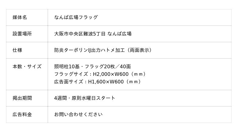 大阪・ミナミの玄関口に位置し、休日約21万人、平日約11万人が往来する大阪屈指の人流拠点「なんば広場」。この場所にて、広場内の照明柱全10基を活用したフラッグ広告を、2025年12月1日より申込受付を開始し、2026年3月より本格稼働いたします。