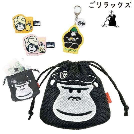 サウナをテーマに「ゴリラのまもるさん」が心と体をやさしくととのえてくれる ととのい系ブランド「ごリラックス」ミニボトルをまとめるのにちょうどイイ、通気性抜群のメッシュ巾着と、サ飯をテーマにした可愛い前髪クリップ&キーホルダーをセットにした4点セット。