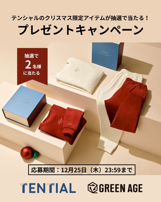 阪急うめだ本店 8階 『GREEN AGE』コトコトステージ81では、12月17日(水)~25日(木)の期間、「TENTIAL(テンシャル)」のポップアップを開催します。クリスマスシーズンに向けて、 家族や恋人、友人など大切な方の体を労わるクリスマスギフトとして、快適な睡眠を提供するリカバリーアイテムをご提案。クリスマス限定カラーの人気リカバリーウェアBAKUNEや、通常阪急では展開していない寝具やブランケットも期間限定で登場します。