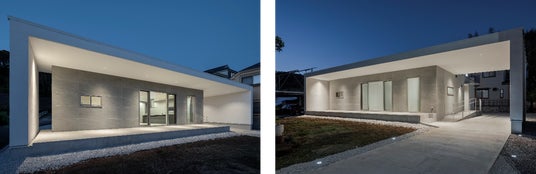 テラスの軒、駐車場の屋根、そして建物両端の袖壁を同じ見附寸法(厚み)で一体に繋げることで、シンプルながらも印象的な輪郭を