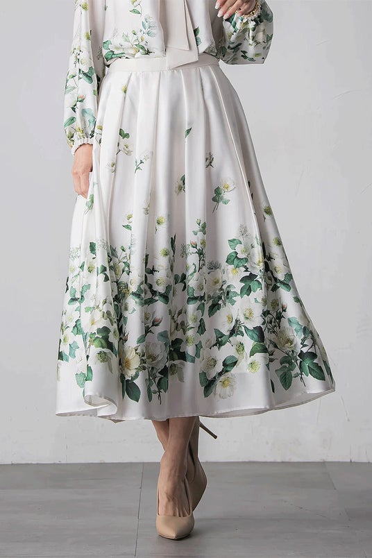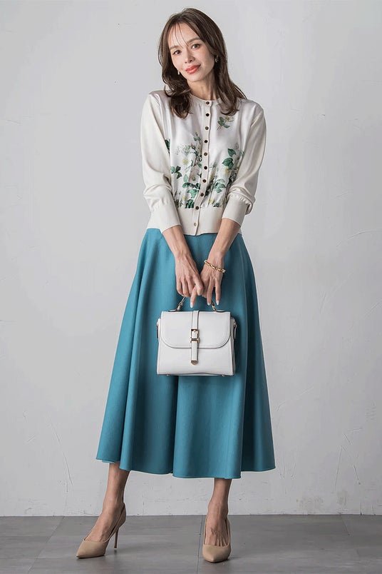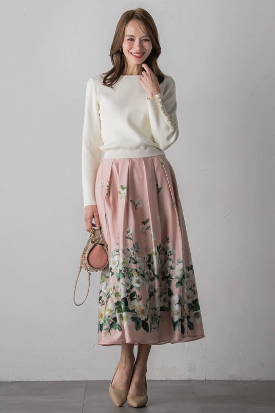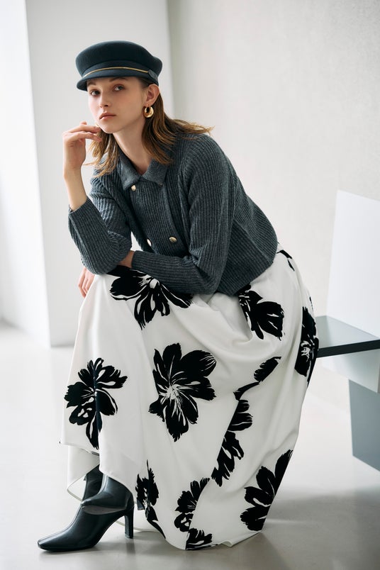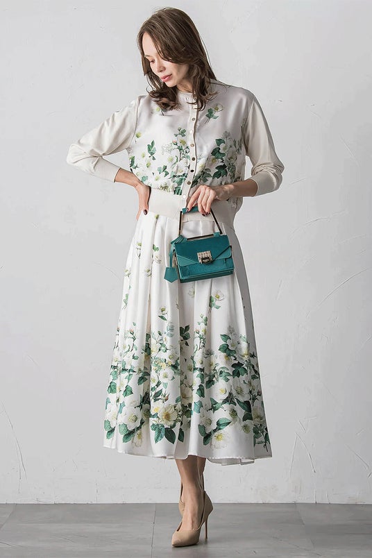 ウエストに無地の配色を施したデザインが、全体を引き締めつつ洗練された印象に。ふんわりと広がるタック入りのフレアシルエットが、動くたびに上品な揺れを生み出します。 裾には華やかに咲き誇るクリスマスローズをあしらい、モチーフはウエストに向かって繊細にフェードアウト。主張しすぎず、かつ目を引くそんな絶妙なバランスで、冬のおしゃれを優雅に彩る一着です。年末年始の特別なお出かけや、品よく華やかさを添えたいシーンにおすすめです。