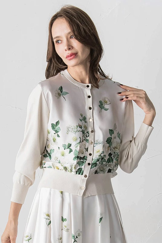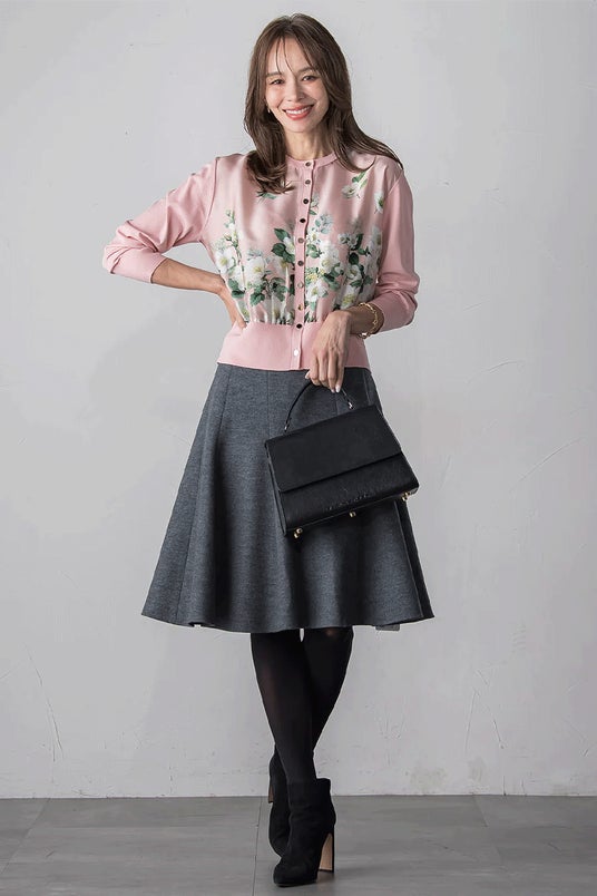 前身頃にのみオリジナルのクリスマスローズ柄プリント生地をあしらった、上品で華やかなニットカーディガン。控えめなデザインの中にも、プリントの存在感が光る一枚で、さらりと羽織れて、季節の変わり目にも重宝するアイテムです。きちんと感のあるクルーネックとシンプルなシルエットで、日常のお出かけにも馴染みやすく、同シリーズのスカートと合わせたセットスタイルでは、より華やかで洗練された印象に。さりげなく華やぎを添える、主役になる一着です。
