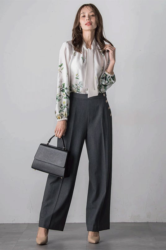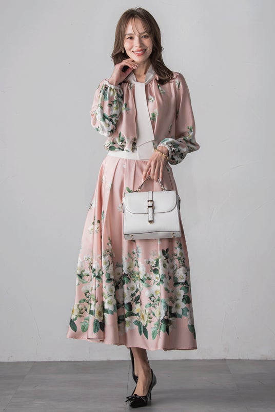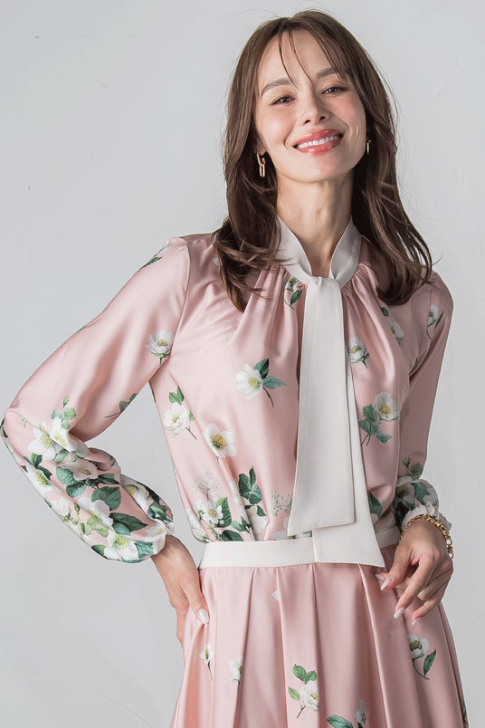 顔まわりを華やかに彩る配色のボウタイディテールが印象的な一枚。程よい光沢感をもつサテン素材に、鮮やかに描かれたクリスマスローズが上品に映え、フェミニンでありながら、甘すぎず洗練された印象を与えてくれます。ボウタイは結び方次第で印象を変えられるのも嬉しいポイント。同柄のスカートとのセットアップはもちろん、シンプルなボトムに合わせて主役アイテムとしても活躍します。年末年始の華やかなシーンに、自信を添えてくれるブラウスです。