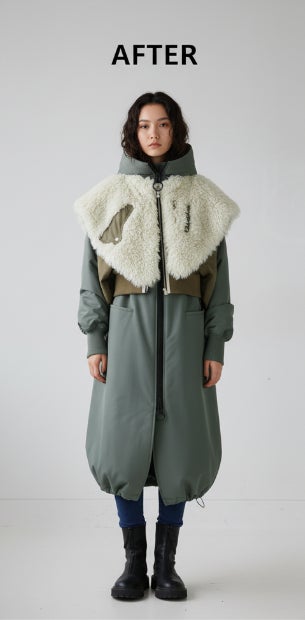 商品写真1枚から、撮影を行うことなく、シルエットや素材感、着用時のバランスまでを反映した画像が生成されています。
